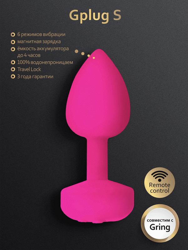 Важно! Если использовать пробку "G-Plug S" совместно с кольцом "G-Ring", кольцо в этом случае будет выполнять роль дистанционного пульта управления. Синхронизировать кольцо с пробкой очень просто, следует одновременно нажать на кнопку включения пробки и кнопку "+" на кольце. Световой индикатор должен загореться на обоих девайсах. Далее, при помощи кнопки "вибрация" на кольце переключайте режимы, а при помощи кнопок "+" и "-" на кольце меняйте скорости! Для отключения синхронизации нажмите кнопку "-" на кольце!