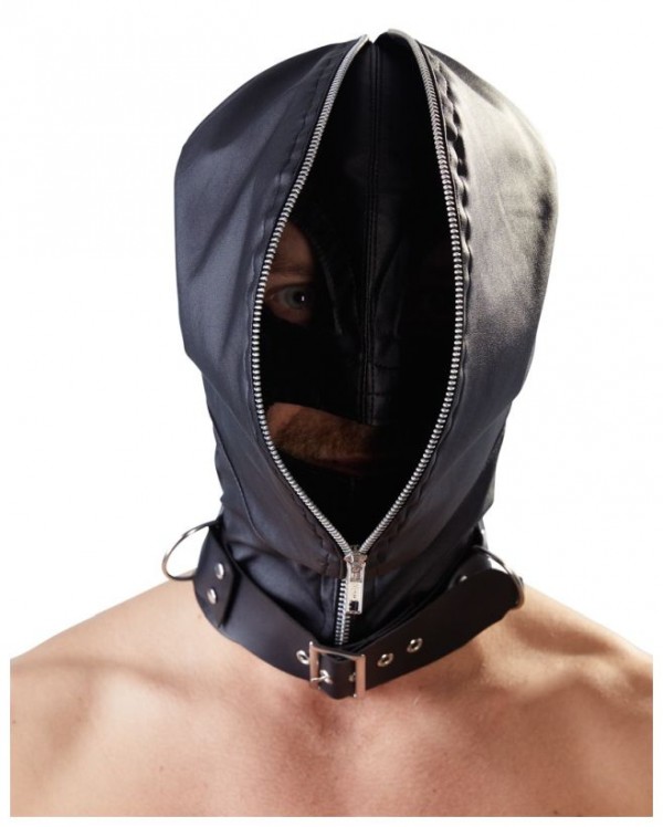 Внутренняя маска имеет разрезы на уровне глаз и рта. При этом, внешняя маска просто открывается и образует своеобразный воротник! Если же, Вам необходима полнейшая депривация закрываем молнию!