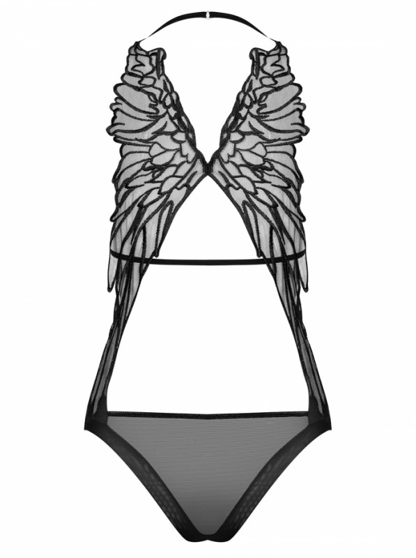 Выполнено боди из эластичного нежного полупрозрачного материала. Лиф выполнен из стрейч-атласного материала. Но, самое интересное - это, оголенная спина и роскошные вышитые крылья! Крылья максимально детализированы, что придает образу особенную пикантность!