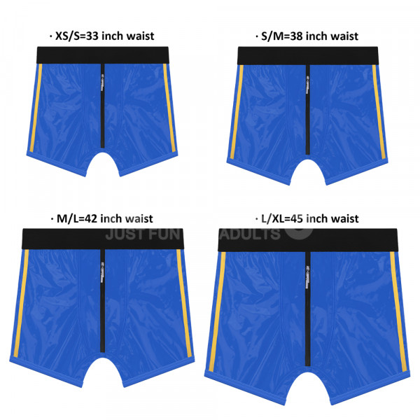 Трусики выполнены в синем цвете с желтыми полосками по бокам из винила. Провокационный блеск винила придает особенную пикантность образу! Молния спереди создает завесу тайны и скрывает истинное предназначение трусиков. Под молнией скрывается кольцо, к которому крепятся любые фаллоимитаторы и вибраторы.  Плотное кольцо гарантирует идеальную фиксацию фаллоса